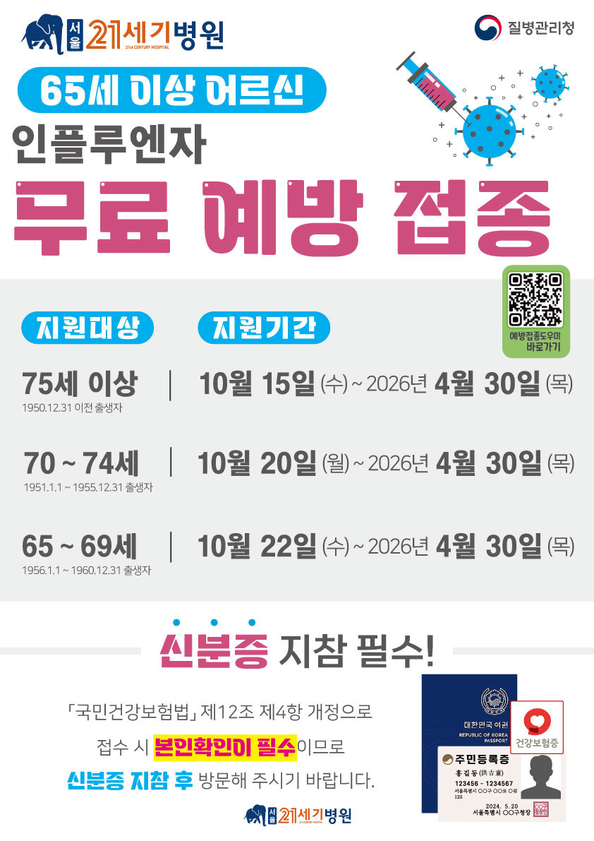 ¼¿ï21¼¼±âº´¿ø¿¡¼´Â 65¼¼ ÀÌ»ó ¾î¸£½ÅÀ» ´ë»óÀ¸·Î µ¶°¨ ¹«·á ¿¹¹æÁ¢Á¾À» ½Ç½ÃÇÕ´Ï´Ù.👾