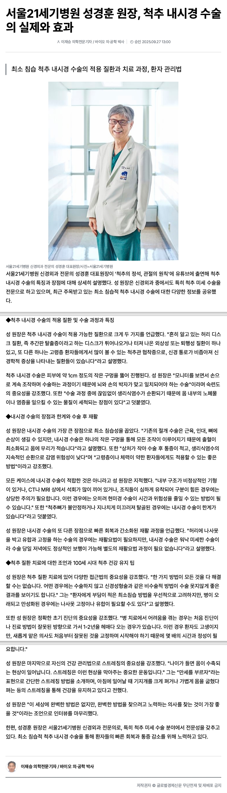 [±Û·Î¹ú°æÁ¦½Å¹®]½Å°æ¿Ü°ú ¼º°æÈÆ ´ëÇ¥¿øÀå´Ô - ¼¿ï21¼¼±âº´¿ø ¼º°æÈÆ ¿øÀå, ôÃß ³»½Ã°æ ¼ö¼úÀÇ ½ÇÁ¦¿Í È¿°ú