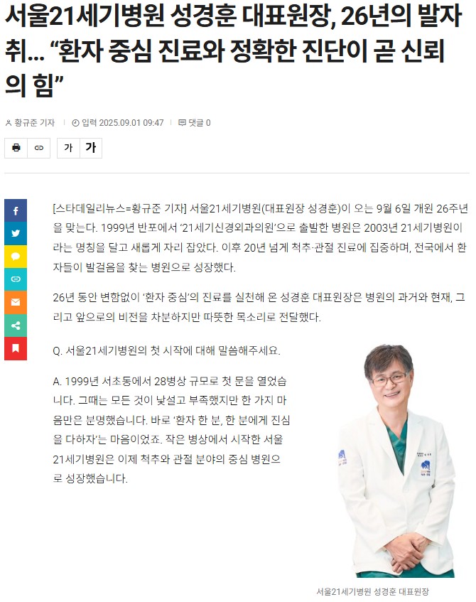 [½ºÅ¸µ¥Àϸ®´º½º] ½Å°æ¿Ü°ú ¼º°æÈÆ ´ëÇ¥¿øÀå´Ô - ¼¿ï21¼¼±âº´¿ø ¼º°æÈÆ ´ëÇ¥¿øÀå, 26³âÀÇ ¹ßÀÚÃë... "ȯÀÚ Á᫐ Áø·á¿Í Á¤È®ÇÑ Áø´ÜÀÌ °ð ½Å·ÚÀÇ Èû"